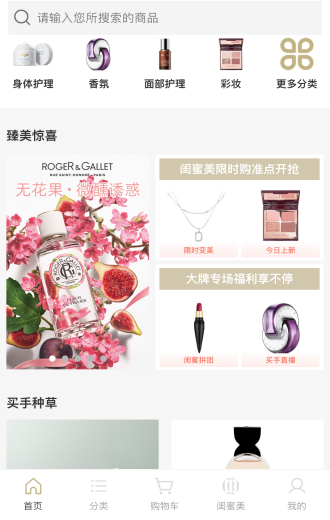 一款专为女性设计的美妆购物平台,提供身体护理、香氛、面部护理和彩妆等多样化商品。用户可以通过分类搜索快速找到所需产品,并享受限时抢购、大
