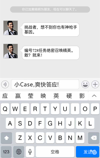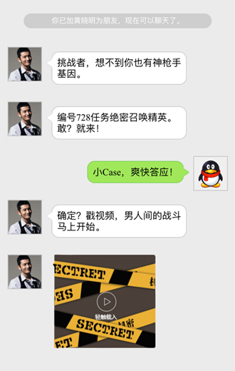 这个H5融合了多种形式:模拟微信对话+视频+CF射击互动,通过微信与黄晓明对话,然后以主角第一视觉进入到射击对战视频,视频中加入射击敌人交互,射击成功后视频继续播放,让人感觉不是在看视频,最后发出游戏发布会的邀请活动。整个活动带入感非常强,从微信加黄晓明好友对话,再到视频,整体过度十分自然,又很出乎意料,一下子就给人留下了深刻的印象。