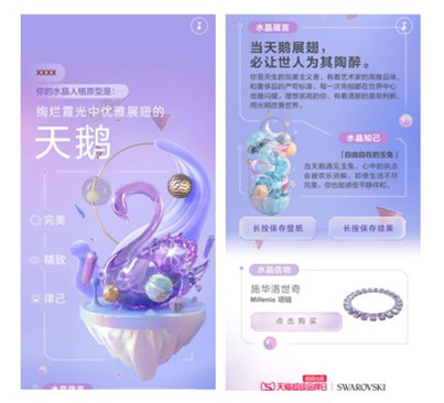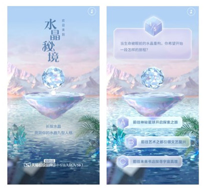 近日,天猫超级品牌日&SWAROVSKI打造一支以水晶为主题的性格测试类H5,搭建起品牌与年轻人的互动场,为施华洛世奇超品日活动造势的同时,更着力于帮助品牌更好地表达自己。