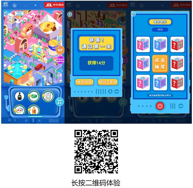 京东在双十一推出的寻宝互动游戏H5,用户需要在京东欢乐城寻找根据给出的图片,找到相对应的物品,一共分为三关,每轮游戏结束后可点击“继续游戏”或者“前往主会场”,游戏结束后可以点击“抽奖”利用游戏积分抽取相应的奖品。通过小游戏寻找不同的品牌,加强品牌记忆的同时也形成广告洗脑植入,并引流用户至京东主会场。