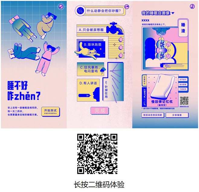 测试睡眠H5,测试生活中有哪些小事会打扰到参与者的睡眠质量,一共分为六道题,通过对题目的答题,最后生成个人睡眠画像,海报上根据不同测试结果推荐不同的枕头商品,不仅增加了品牌的传播同时还提高产品销量。