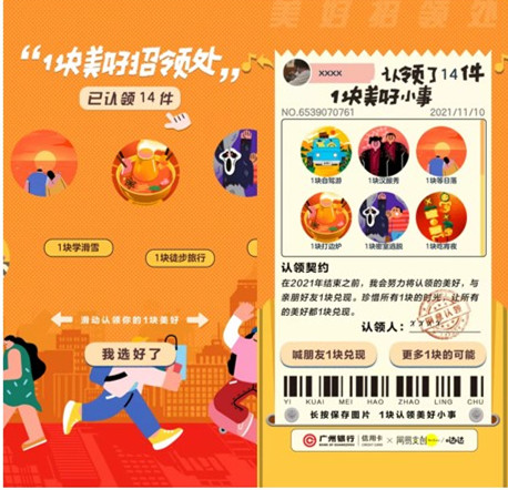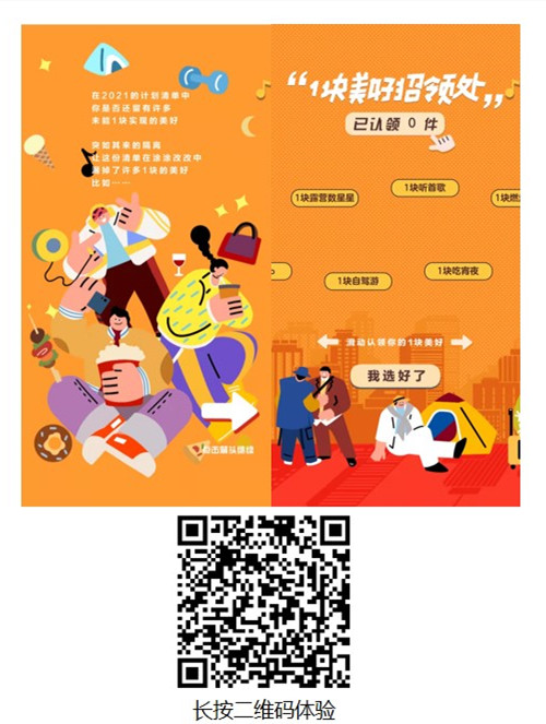 这是广州银行信用卡×网易文创哒哒制作清单类H5,旨在提醒2021即将结束,还有很多美好生活需要“1块”兑现,从而引导用户参与“1元购”活动。